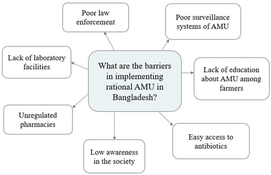 Findings from key informant interviews regarding antimicrobial use were similar to studies carried out in other LMICs, highlighting the high proportion of OTC sales of antibiotics, poor surveillance, and lack of awareness [,]. Other studies [,] have shown inappropriate sales of antibiotics in Bangladesh, and this was identified as a barrier to reducing AMR. These factors contribute to antimicrobial use and AMR within the country []. Numerous studies have been conducted in the area of OTC antibiotic sales in an effort to understand why this route of administration is so common. A low understanding of AMR, pharmacist education, and the fact that pharmacies are frequently the first point of contact were all cited as potential explanations. [,]. At least two of these three factors were also mentioned in KIIs as contributing to high OTC sales.