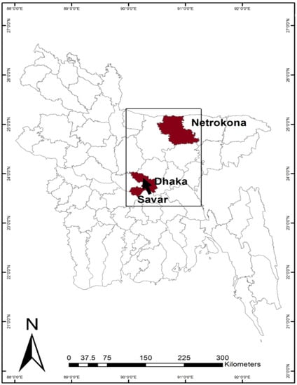 Map of Bangladesh including sites for sampling, showing the Netrokona and Dhaka district. The location of Savar within the Dhaka district is indicated by an arrow.