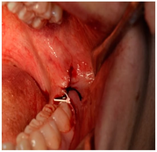 Image of PTFE and silk suture after M3M surgery placed distally to the second molar with a first intention closure technique.