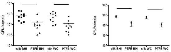 This graph on the left shows a comparison of CFUs of silk and PTFE sutures in BHI and WC; the population distribution is reported on the right.
