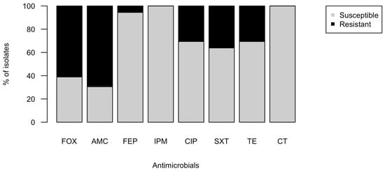Disc diffusion tests were performed to identify sensitivities to 8 other types of antibiotics with ranging clinical applications: Colistin (CT) (10 µg/mL), Sulfamethoxazole/Trimethoprim (SXT) (25 µg/mL), Tetracycline (TE) (30 µg/mL), Ciprofloxacin (CIP) (5 µg/mL), Cefoxitin (FOX) (30 µg/mL), Amoxicillin/Clavulanic Acid (AMC) (30 µg/mL), Imipenem (IPM) (10 µg/mL), and Cefepime (FEP) (30 µg/mL) (Hardy Disks™, Thermo Fisher Scientific, Waltham, MA, USA). Isolates were standardized and spread onto Mueller Hinton II agar plates with the same procedure used for the MIC E-tests. Four antibiotic discs were evenly spaced apart from each other on the agar plates using sterile forceps. The plates were then incubated overnight at 37 °C, and the diameter of the zone of inhibition was measured (in mm). Results were compared to the Clinical and Laboratory Standards Institute (CLSI) guidelines to classify each isolate as susceptible, intermediate, or resistant [44].