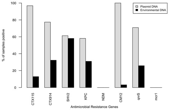 Percent of isolate plasmid DNA samples (n = 31) and environmental DNA samples, (n = 29), that had positive amplifications for genetic determinants of antimicrobial resistance.