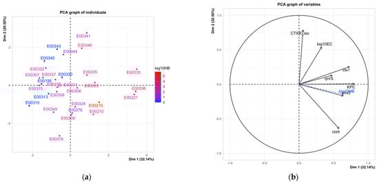 Principal component analysis of environmental sites using the input variables using percent of CTX isolates, the presence of specific resistance genes, and E. coli concentrations (log10EC). (a) Ordination of sites by the two principal component axes. Sites are shaded by the log10 concentration of HB. (b) Impact of variables on sample ordination. Variables shown in black were used in the analysis; log10 HB (in blue) was supplementary.