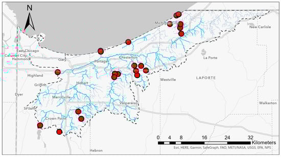 Water samples were collected from lake water and tributary creeks and streams across the Lake Michigan watershed in Indiana. Collection sites are indicated by red dots. The watershed boundary is indicated by a dashed black line.