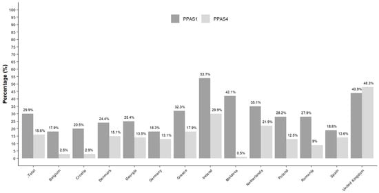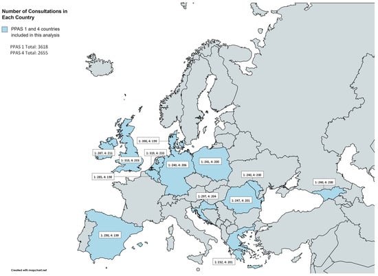 Participating general practices in countries involved in the repeated PPAS and from which a full dataset was available for PPAS-1 and -4 were Belgium, Croatia, Denmark, Georgia, Germany, Greece, Ireland, Moldova, the Netherlands, Poland, Romania, Spain, and the United Kingdom (UK) (Figure 4). Armenia was excluded as they only recruited in a paediatric setting, while other countries recorded consultations in all age groups. Israel and Italy were excluded because they only collected data in a paediatric setting for PPAS-1 and only in long-term care for PPAS-4. Norway, Hungary, France, and Ukraine were excluded because they did not participate in PPAS-4. Nearly all consultations (86.4%) were in general practices that participated in both PPAS-1 and -4.