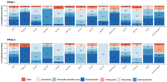 Overview of the percentage of each antibiotic prescribed, overall and by country in PPAS-1 and PPAS-4.