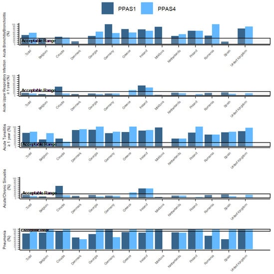 The percentage of adult patients with bronchitis who receive an antibiotic should, according to the QI, not exceed 30%. This QI was not met by any country, except for Denmark and Spain, in both PPASs. For patients (over one year of age) with acute upper RTI, less than 20% should be prescribed an antibiotic, which was achieved by most countries, except Ireland in both PPAS, Croatia (PPAS-1), and Greece (PPAS-4). In the same countries, antibiotic prescribing also exceeded the acceptable range of 0–20% for acute or chronic sinusitis. For pneumonia in adults, prescribing is acceptable in 90–100% of the cases, and this is lower in many countries. However, the number of patients in each country with pneumonia was relatively low (between 1 and 26). Prescribing for tonsillitis in the over-one-year age group exceeded the acceptable range of 0–20% for all countries and was 69% and 75% for PPAS-1 and PPAS-4, respectively (Figure 3).