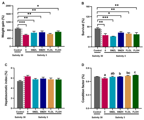 Figure 1. Weight gain (A), survival (B), hepatosomatic index (C) and conditional factor (D) of L. vannamei exposed to SMZ and FLO under low salinity environment for 28 days. All data are expressed as the mean ± SE (n = 4). Different letters (a–c) and * p < 0.05, ** p < 0.01, *** p < 0.001 indicate significant differences among groups.