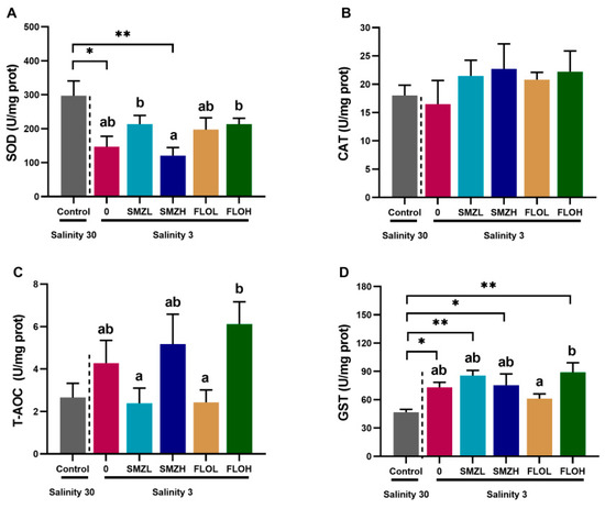Figure 2. Hepatopancreas oxidative stress response of L. vannamei exposed to SMZ and FLO under low salinity environment for 28 days. SOD activity (A), CAT activity (B), T-AOC activity (C) and GST activity (D). All data are expressed as the mean ± SE (n = 4). Different letters (a,b) and * p < 0.05, ** p < 0.01 indicate significant differences among groups.