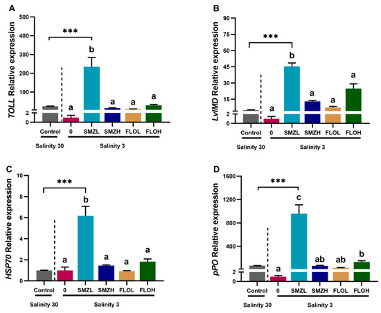 Figure 3. Innate immune responses of L. vannamei exposed to SMZ and FLO under low salinity environment for 28 days. TOLL (A), LvIMD (B), HSP70 (C) and PPO (D) mRNA expression. All data are expressed as the mean ± SE (n = 4). Different letters (a–c) and *** p < 0.001 indicate significant differences among groups.