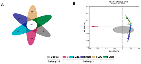 Figure 4. Differences between intestine microbiota communities of L. vannamei exposed to SMZ and FLO under low salinity environment for 28 days. Venn diagram (A), PCoA analysis (B).