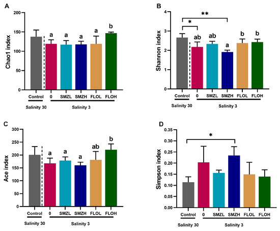 Figure 5. Alpha diversity indices of intestinal microbiota in L. vannamei exposed to SMZ and FLO under low salinity environment for 28 days. Chao1 index (A), Shannon index (B), Ace index (C) and Simpson index (D). All data are expressed as the mean ± SE (n = 3). Different letters (a,b) and * p < 0.05, ** p < 0.01, indicate significant differences among groups.