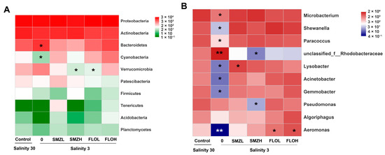 At the phylum level, Proteobacteria, Actinobacteria and Bacteroidetes were the dominant phyla in all groups (Figure 6A). Compared to the control group, Bacteroidetes abundances were significantly increased while Cyanobacteria abundances were significantly decreased in the 0 (salinity 3) group (p < 0.05). However, the proportions of Verrucomicrobia were significantly decreased in the SMZH and FLOL groups. At the genus level, Microbacterium was the dominant genus with the highest abundance in all groups (Figure 6B). Compared with the control group, Microbacterium, Shewanella, Paracoccus, Lysobacter, Acinetobacter, Gemmobacter and Aeromonas abundances were significantly decreased in the 0 group. Moreover, the abundance of Lysobacter was significantly increased in the SMZL group and Pseudomonas was significantly decreased in the SMZH group. In addition, Aeromonas was increased in the FLOL and FLOH groups.