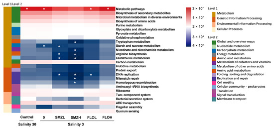 In this study, PICRUSt function prediction analysis revealed that the metabolism, genetic information processing, environmental information processing and cellular processes between the control and each treatment group were significantly different. Amino acid metabolism was reported to play an important role in the osmoregulation of L. vannamei in a low-salinity environment [55]. The metabolism of “tryptophan”, “starch and sucrose”, “nicotinate and nicotinamide”, “arginine biosynthesis” and “glutathione” was significantly decreased in SMZ groups. A previous study reported that amino acids were abundantly consumed as an energy source when animals were exposed to low salinity [56]. In this regard, we speculate that the addition of SMZ may reduce the ability of L. vannamei in amino acid-based osmoregulatory systems of low-salinity adaptation. In addition, the “replication and repair” pathway was increased significantly in L. vannamei under the stress of WSSV infection [57], and temperature fluctuations [58] were significantly decreased by SMZ and FLOL in the present study. This inconsistency may be due to the co-effect of low salinity and antibiotics.