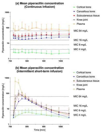 Intermittent short-term infusion of piperacillin/tazobactam (pip/tazo) continues to be the standard clinical practice in most orthopedic settings when indicated for PJI treatment. Nevertheless, continuous infusion has been shown to be superior in terms of longer fT > MIC, reduced mortality, and increased cure rates in critically ill patients [,,,,]. Evaluation of piperacillin concentrations in target tissues relevant for PJI treatment following continuous infusion is lacking and may be included in future dosing regiments for piperacillin [].