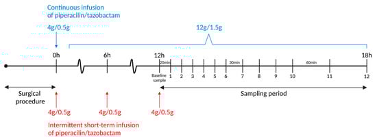 Timeline illustrating piperacillin/tazobactam dosing and sampling in the two administration groups. Created with BioRender.com.