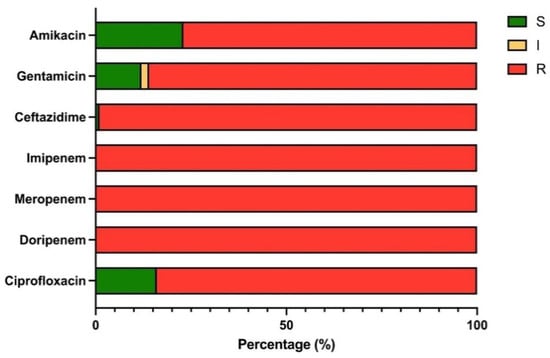 Antimicrobial susceptibility profiles of 172 carbapenem-resistant A. baumannii isolates in clinical samples are represented as a percentage. S: sensitive; I: intermediate; R: resistance.