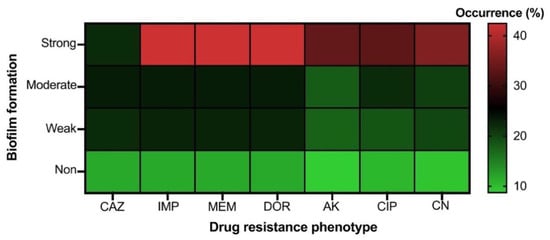 A heatmap demonstrating the percent distribution of 172 carbapenem-resistant A. baumannii isolates from nosocomial biofilm-forming and antimicrobial-resistant samples. The color band depicts the percentage of biofilm features associated with a particular drug-resistant phenotype. GraphPad Prism 9 was used to generate the heatmap (La Jolla, CA, USA). CAZ, ceftazidime; IPM, imipenem; MEM, meropenem; DOR, doripenem; AK, amikacin; CIP, ciprofloxacin; CN, gentamicin.