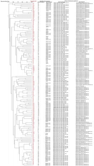 For determining genotyping and clonal relationships between CRAB strains, the gels were stained and the DNA bands were photographed and visualised using a UV transilluminator. The images of DNA banding patterns were analysed with GelJ software version 3.0 (San Diego, CA, USA) and the dendrogram was created using the unweighted pair group method with arithmetic averages and Dice’s similarity coefficient with a tolerance of 1.0% [64,65]. A similarity of 70% or greater indicated the same REP-PCR genotype, whereas a similarity of less than 70% indicated different REP-PCR genotypes.