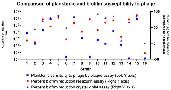 Comparison of planktonic and biofilm susceptibility to phages. Planktonic sensitivity to phages as assessed by plaque assay (blue square) is shown on the logarithmic scale on the left-sided Y axis. The per cent reduction in biofilm cell viability (red circle—assessed by immunofluorescent resazurin assay) and biofilm biomass (purple triangle—assessed by crystal violet OD readings) are plotted on the right-sided Y axis.