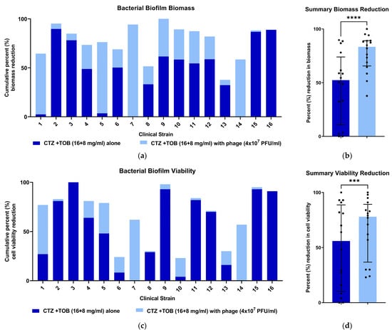 The percent reduction in biofilm biomass and cell viability with antibiotic combination and phage. Dark blue shows the amount of biofilm reduction with the antibiotic combination alone, with the added light blue showing the additional reduction in killing when the bacteriophage was added. The bars, when shown, represent the median and interquartile range. (a) The percent reduction of biofilm biomass when the phage cocktail was added to a CTZ + TOB antibiotic mixture for each strain. (b) The addition of the phage cocktail resulted in a further 1.7-fold reduction in biofilm biomass across the 16 strains (****, p < 0.0001 using the Wilcoxon signed rank test) compared with the dual antibiotics alone. (c) The percent reduction in metabolic activity of biofilm cells when the phage cocktail was added to a CTZ + TOB antibiotic mixture. (d) The addition of the phage cocktail resulted in a further 1.3-fold reduction in cell viability across the 16 strains (***, p < 0.001 using the Wilcoxon signed rank test) compared with the dual antibiotics alone.