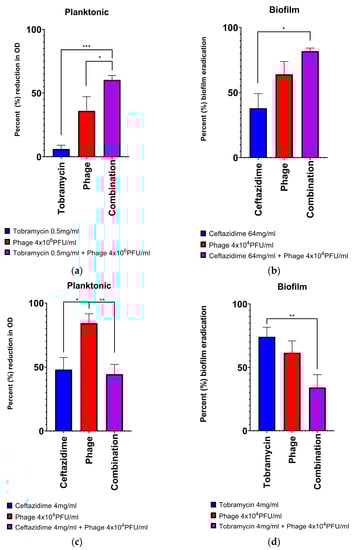Here, we wished to explore the efficacy of a 4-phage cocktail that has been used in several preclinical studies and for compassionate use [,,,] against Pa isolates from CF airway samples. We used two common anti-Pseudomonal antibiotics: ceftazidime and tobramycin. In the first experiments, we use a high-concentration combination of these two agents and assess the extra biofilm reduction with the addition of phage in 16 different Pa clinical strains. In the subsequent experiments, we investigate the effects of subinhibitory concentrations of phage cocktail along with subinhibitory concentrations of ceftazidime and tobramycin individually, in both biofilm and planktonic culture for 10 different strains.
