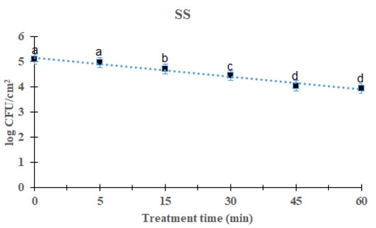 A first-order kinetics model was used to calculate the D-values for the reduction of L. monocytogenes mixed cultures on the SS, HG, and SR coupons. The D-value represents the plasma treatment time necessary to achieve a reduction in bacterial density of 1 log CFU/cm2 (>90%). A regression line that accurately described the data points had an R2 value near to 1. Using the formula D = −1/slope from a microbial population vs. DBD plasma curve, the D-value (min) was determined.