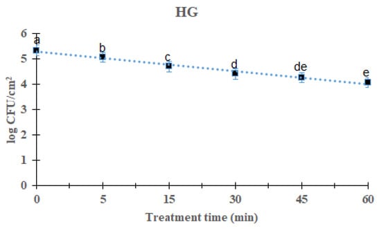 Overall L. monocytogenes mixed-culture biofilms reduction reduced significantly (p < 0.05) with increasing time after 60 min treatment of DBD plasma (Figure 2). For DBD plasma treated for 5, 15, 30, 45, and 60 min, the average of the L. monocytogenes mixed-culture biofilm was reduced to 5.06 (0.28 log reduction), 4.70 (0.64 log reduction), 4.41 (0.93 log), 4.21 log (1.27 log) and 4.27 log, respectively, compared with the initial titer of the L. monocytogenes biofilm 5.34 log CFU/cm2. There was a significant difference in the treatment for 60 min when compared with other treated and control groups except the 45 min-treated group of DBD plasma. The survival of mixed culture L. monocytogenes biofilms on the HG surface in response to DBD plasma treatment was calculated using the first-order kinetic model (Figure 2). The parameters of the first-order kinetic model are presented in Table 1. Using a first-order kinetic model, we determined a 50.25 min D-value and an R2 of 0.92 for the L. monocytogenes mixed-culture biofilm on the HG surface.