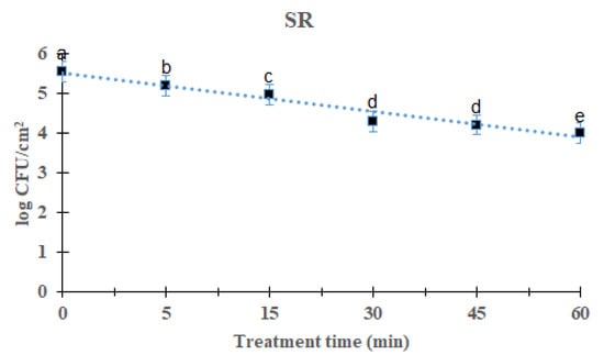 L. monocytogenes mixed-culture biofilms on the SR surface are shown in Figure 3. As the processing time increased, the total L. monocytogenes mixed-culture biofilm decreased significantly after DBD treatment (p < 0.05). After treatment for 5, 15, 30, 45, and 60 min, the overall mean of L. monocytogenes mixed-culture biofilms was 5.19 (0.37 log reduction), 4.98 (0.58 log reduction), 4.30 (1.26 log reduction), 4.21 (1.35 log reduction), and 4.01 (1.55 log reduction) log CFU/cm2, respectively, compared with the initial titer of L. monocytogenes mixed-culture biofilms, i.e., 5.56 log CFU/cm2. Significant difference was found in the 60 min-treated group compared with other groups. The survival of L. monocytogenes mixed-culture biofilms on the SR surface in response to DBD plasma treatment was calculated using a first-order kinetic model (Figure 3). First-order kinetic model calculations of the L. monocytogenes mixed-culture biofilm on the SR surface calculated a D-value of 39.53 min and an R2 of 0.92 (Table 1).