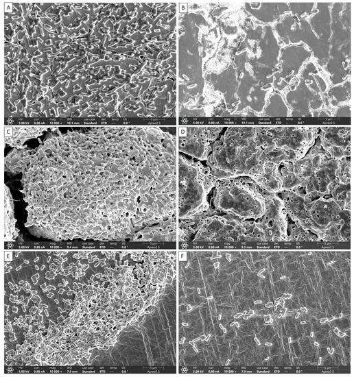 Representative scanning electron micrographs of Listeria monocytogenes mixed-culture biofilms formation DBD plasma treatment on the SS surfaces: (A) control; (B) 60 min DBD plasma treatment, HG surfaces: (C) control; (D) 60 min DBD plasma treatment and SR surfaces: (E) control; (F) 60 min DBD plasma treatment.