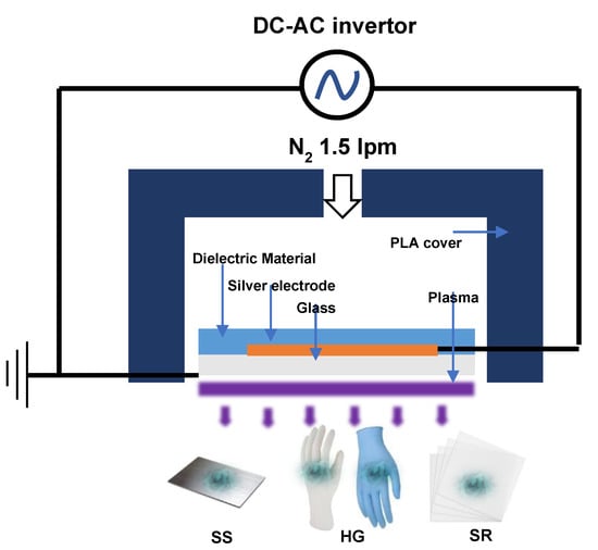 After the formation of biofilms on the SS, HG, and SR surfaces, DBD plasma (μ-DBD Surface Plasma Generator, Model; Micro DBD plasma) treatment was initiated (Figure 5). The experiment was conducted in triplicate. The equipment used for the DBD plasma treatment was a plasma generator (Plasma Biomedical Research Institute in Seoul, Republic of Korea). A 1.5 L/min nitrogen flow was used to generate DBD plasma between a glass and metal mesh grid on the back glass. The DBD plasma transferred a low discharge voltage of approximately 1 kV and discharge peak current of 40 mA at a driving frequency of 43 kHz [48]. During the treatment, the distance between the plasma-emitting electrode and the samples was maintained at 3 mm. The SS, HG, and SR surfaces were exposed to the DBD plasma for 5, 10, 15, 30, 45, and 60 min, respectively.