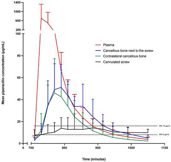 - Petersen, E.K.; Hanberg, P.; Knudsen, M.; Tøstesen, S.K.; Jørgensen, A.R.; Öbrink-Hansen, K.; Søballe, K.; Stilling, M.; Bue, M. Intermittent Short-Term Infusion vs. Continuous Infusion of Piperacillin: Steady State Concentrations in Porcine Cervical Spine Tissue Evaluated by Microdialysis. Antibiotics 2022, 11, 910. [Google Scholar] [CrossRef]