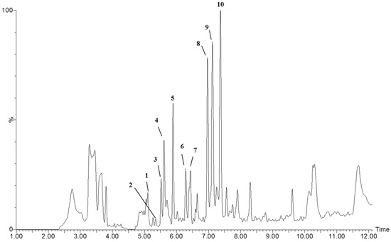 UHPLC-MS-QTOF analysis was applied for the qualitative chemical characterization of different metabolites in Vp-LRE. The components of Vp-LRE were separated and analyzed by UHPLC-MS-QTOF, and a typical UHPLC-MS-QTOF chromatogram of Vp-LRE, at negative ion mode, is shown in Figure 1. Glaucolide A and apigenin were identified and eight compounds were annotated, and detailed information of each peak is listed in Table 1. Peak annotation was based on each compound’s molecular ions and its MS/MS studies (Table 1), as well as comparison with the available literature. The options with the lower mass error values and the higher MS scores useful for obtaining better confident formula assignments were preferable. The structures of the proposed compounds were tentatively annotated through studying the fragmentation pattern using MS/MS spectra. In addition, the retention time (Rt) served as criterion of polarity and elution order, which was used for the numbering of the compounds (Figure 1 and Table 1).