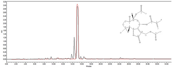 As glaucolide A (1; Figure 2) was identified as one of the most representative compounds in Vp-LRE, it was isolated from the extract via chromatographic fractionation and additionally identified by 1H- and 13C-NMR data analysis in comparison to literature [24,25] 1H NMR (500 MHz, CDCl3) δ (ppm): 1.53 (3H; s, H-15); 1.64 (4H, s, H-3b and H-14); 1.92 (3H, q, J = 1.0 Hz, H-4′); 2.04 (3H, s, H-2″); 2.06 (3H, s, H-2″); 2.29 (2H, m, H-2b and H-3a); 2.59 (1H, m, H-9b); 2.79 (2H, m, H-5 and H-9a); 2.93 (1H, m, H-2a); 4.80 (3H, m, H-8, H-13a and H-13b); 4.89 (1H, d, J = 9.5 Hz, H-6); 5.69 (1H, t, J = 1.0 Hz, H-3′); 6.14 (1H, t, J = 1.0 Hz, H-3′).13C NMR (125 MHz, CDCl3) δ (ppm): 18.0 (C-4′); 18.8 (C-14); 20.7 (C-15); 21.0 (C-2‴); 22.4 (C-2″); 31.8 (C-3); 32.8 (C-2); 40.3 (C-9); 55.0 (C-13); 58.7 (C-5); 61.4 (C-4); 64.4 (C-8); 80.8 (C-6); 84.7 (C-10); 125.0 (C-11); 127.8 (C-3′); 134.7 (C-2′); 163.3 (C-7); 166.2 (C-1′); 169.7 (C-12); 170.2 (C-1‴); 170.9 (C-1″); 206.6 (C-1). The purity of the isolated glaucolide A was estimated to be higher than 95% via HPLC-DAD analysis (Figure 2).