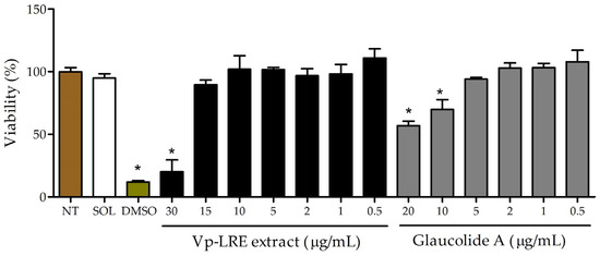 RAW 264.7 cells were selected to evaluate the in vitro cell viability/cytotoxicity because macrophages play a critical role in bacterial infections, as they are responsible for engulfing and destroying invading bacteria as well as producing cytokines, chemokines and reactive oxygen species that help to eliminate bacteria and coordinate the immune response to the infection [26]. This cell line was treated with concentrations ranging from 0.5 to 30 µg/mL of Vp-LRE extract or 0.5 to 20 µg/mL of glaucolide A. After 48 h, the cell viability was determined via MTT assay. As shown in Figure 3, only on the highest concentrations, Vp-LRE (30 µg/mL) and glaucolide A (10 and 20 µg/mL) induced a significant cell viability reduction, compared to the not-treated cells. No significative difference was found between non-treated cells and cells treated with the solvent (DMSO 0.5%). As expected, the positive control (DMSO 5%) reduced the viability by around 90%.
