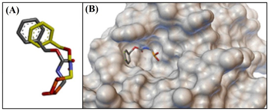 Redocking of the crystallographic ligand at the catalytic site of β-lactamase of S. aureus. (A) Crystallographic ligand conformation (moss) and conformation obtained by redocking (gray); (B) Ligand at the enzyme site.