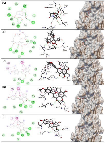 Main molecular interactions between compounds and class β-lactamase catalytic site of S. aureus. (A) Clavulanic acid. (B) Glaucolide A. (C) 3′,4′-Dimethoxyluteolin. (D) Acacetin. (E) Apigenin. Dark green: hydrogen bonding; Light green: Van der Waals; Light pink: alkyl or π-alkyl; Dark pink: π-stacking; Light blue: permanent-dipole. Dashed lines: aromatic ring.
