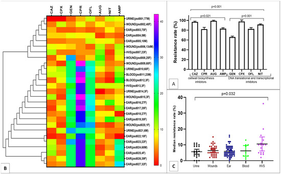 Resistance pattern and Clustergram of the MDR strains ((A), Strain resistance to antibiotic classes; (B), Resistance relatedness; (C), Median resistance rates).