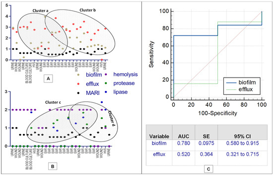 Correlation matrix of phenotypic antibiotic resistance ((A,B), Association of antibiotic resistance, biofilm formation, efflux activity, protease, lipase and hemolysin production; (C), ROC curves).