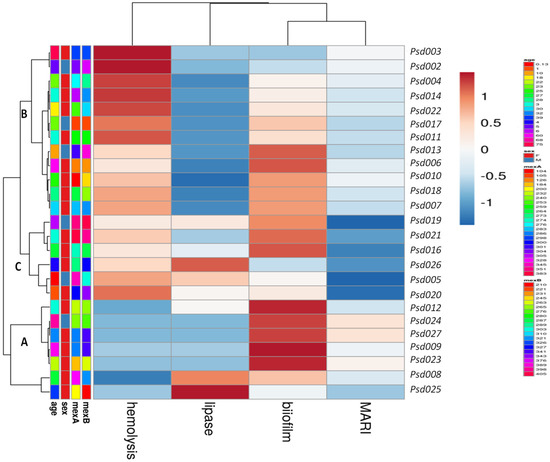 Heatmap of hierarchical clustering of MDR-Psa resistance and virulence profiles in comparison with the age, sex, MexA and MexB efflux proteins (ranging between 158–395 bp), MARI and expressed virulence factors. Rows clustered by UPGMA method using Euclidean distances to define clusters.