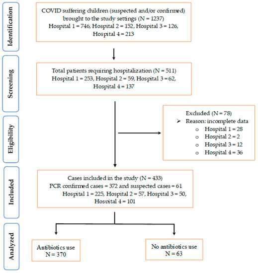 A total of 1237 neonates and children were seen in the emergency rooms of participating hospitals between March 2022 and December 2022. Among these children, 511 were admitted to the COVID-19 wards. Seventy-eight cases were subsequently excluded due to incomplete medical records. This left a final sample of 433 children (Figure 1).