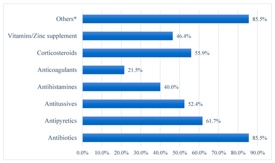 There was appreciable prescribing of antibiotics among the neonates and children hospitalized with COVID19 in our study at >85%, with more than half being prescribed two antibiotics. In addition, nearly one-quarter of admitted patients were prescribed three different antibiotics during their hospital stay, with an average of 1.70 ± 0.98 antibiotics per patient. This is despite only 3.7% of neonates and children having confirmed bacterial co-infections or secondary bacterial infections. However, similarly high rates of antibiotic prescribing were seen in our previous study among all hospitalized neonates and children conducted between 10 December 2021 and 5 January 2022 [13], similar to studies undertaken in Bangladesh (86.3%) and India (75.3%) [9,10]. The prescribing of antibiotics in our study was though higher than seen in studies in Latin America (24.5%) and Turkey [67,77]. In addition, more than half of the antibiotics prescribed in our study were for ≤5 days and via parenteral route of administration. This is similar to a study from Spain, where the majority of the antibiotics administered were prescribed for <5 days among children hospitalized with COVID-19 [71].