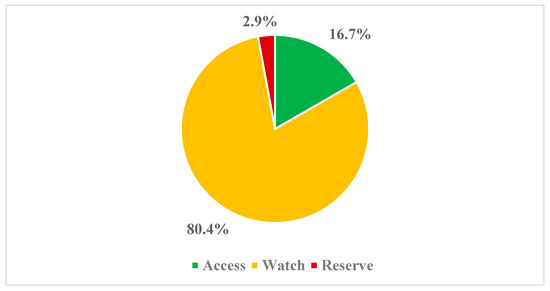 Antibiotic usage grouped according to the AWaRe classification are shown in Figure 3. Most of the prescribed antibiotics were from the ‘Watch’ group (80.4%, n = 592). Only 16.7% (n = 123) of the prescribed antibiotics were from the ‘Access’ group.