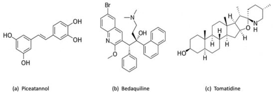 Chemical structure of 3 chemical inhibitors: (a) Piceatannol, (b) Bedaquiline and (c) Tomatidine. Made with BioRender.