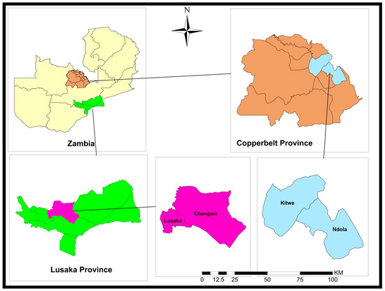 A cross-sectional study was conducted in selected farms in Chongwe and Lusaka (Lusaka Province) and Ndola and Kitwe (Copperbelt Province) districts in Zambia (Figure 2). The two provinces are among those that harbor most of the commercial poultry farms in Zambia.