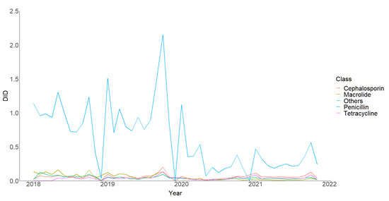 Trend in monthly antibiotic utilisation rates in defined daily dose per 1000 inhabitants per day, by ATC classification, from 2018 to 2021. Abbreviation: DID, defined daily dose per 1000 inhabitants per day.