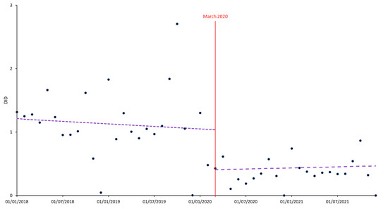 We constructed a monthly time series of antibiotic DID to describe the rates of antibiotic utilisation between January 2018 and December 2021. ITSA with segmented regression analysis were conducted to determine whether there was a measurable change in antibiotic utilisation rates associated with COVID-19. ITSA is a quasi-experimental research design for evaluation of longitudinal effects of interventions in incidents. A noteworthy strength of ITSA in evaluating the impact of policy changes using observational data is that the approach controls for the effect of secular trends in a time series of outcome measures. The ITSA design and use of segmented regression allows for assessment of a change in level (i.e., a change in the intercept) and change in slope associated with the intervention or change in policy while controlling for the overall trend in the outcome rate of interest [29,30]. A total of 26 points were used pre-COVID-19, while 22 points were used post-COVID-19. As a minimum of nine points are required pre- and post-intervention in ITSA, our study thus satisfied and surpassed the minimum number of points required for analysis [31].