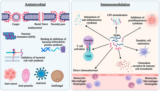 Although they are capable of eliciting proinflammatory and immune responses to facilitate the clearance of pathogens, HDPs mediate largely anti-inflammatory responses during inflammation and infection by inhibiting the expression of proinflammatory cytokines such as interleukin (IL)-1β, IL-6, and tumor necrosis factor-α (TNF-α), while stimulating the production of anti-inflammatory cytokines such as IL-10 [25,26] (Figure 1). Furthermore, cationic HDPs also bind to anionic lipopolysaccharides (LPS) to neutralize its effect on inflammation [3,12].
