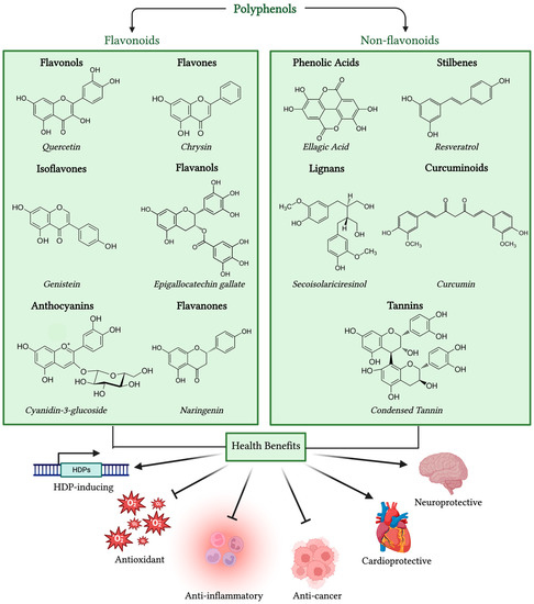Classifications and health benefits of polyphenols. One representative compound is shown in each category for illustrative purposes.