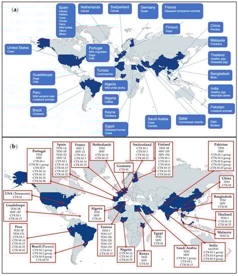 (a) Countries that reported the presence of ESBL-producing bacteria in animals. (b) Countries that reported the presence of ESBL-subtype distribution in animals.